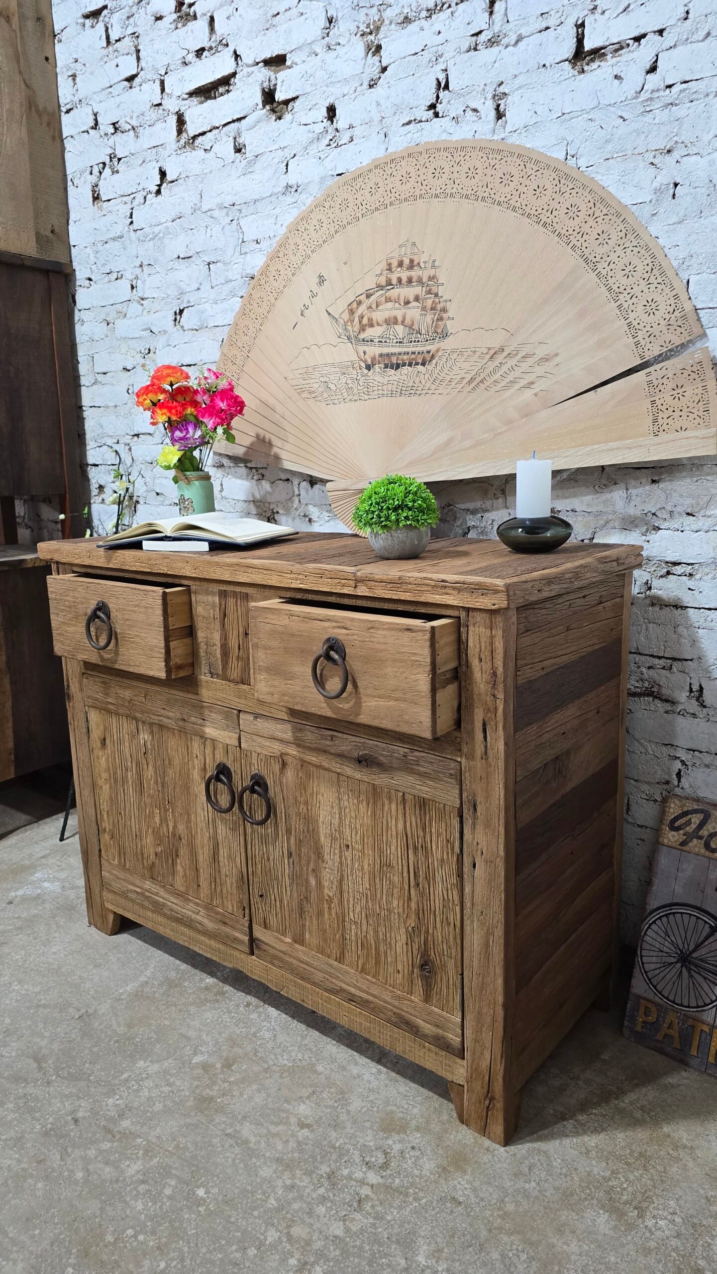 Los dos cajones superiores y el amplio espacio de almacenamiento inferior con puertas de doble apertura ofrecen una solución práctica para mantener tu baño organizado, combinando funcionalidad con una estética natural y robusta. Los tiradores complementan perfectamente el estilo, añadiendo un toque distintivo.